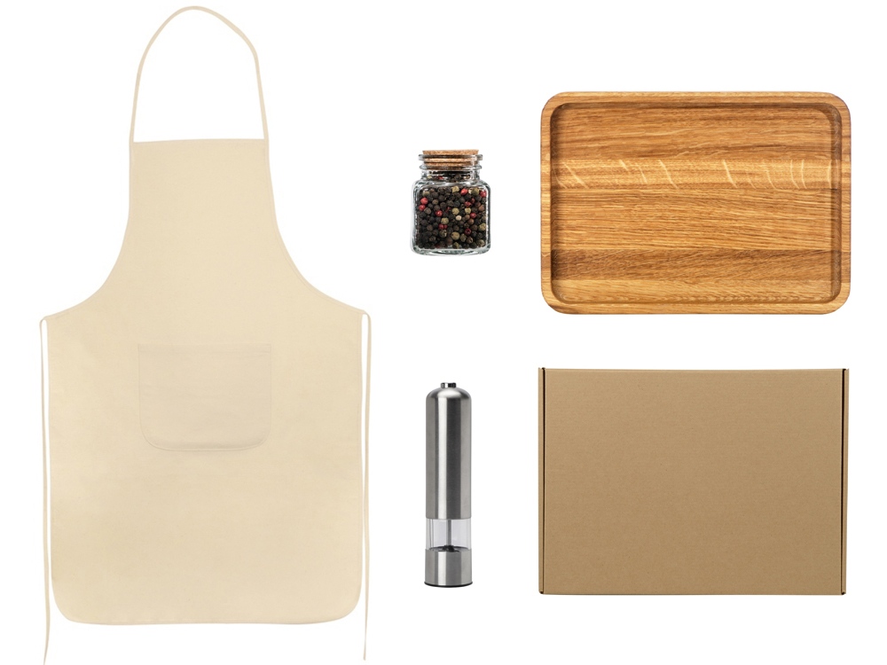 Подарочный набор для кухни с фартуком, подносом, мельницей и специями купить оптом и в розницу с нанесением логотипа в Казани