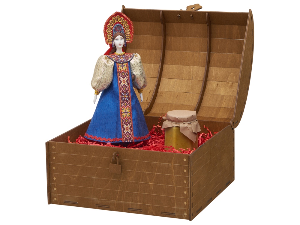 Очарование русских традиций, домашнего уюта и изысканных вкусов соединилось в этом уникальном подарке. Набор создан для тех, кто ценит подлинную красоту и желает подарить незабываемые эмоции. Что внутри: - Фарфоровая кукла в народном костюме ручной работы: расписной сарафан и кокошник с традиционной вышивкой воссоздают образ русской красавицы. - Крем-мёд с лаймом и имбирём (250 г): нежная текстура с яркой цитрусовой ноткой и тёплым имбирным оттенком. Изысканное лакомство для истинных гурманов. - Элегантное оформление: декоративная стружка придаёт композиции глубину и благородство, бережно сохраняя все элементы набора. Роскошная упаковка: деревянный сундук с изящным замочком превращает вручение подарка в особый ритуал. Дополнительное брендирование шильдом спектрум делает презент эксклюзивным и памятным. Идеальный выбор для тех, кто ищет не просто сувенир, а настоящее произведение искусства с русской душой.