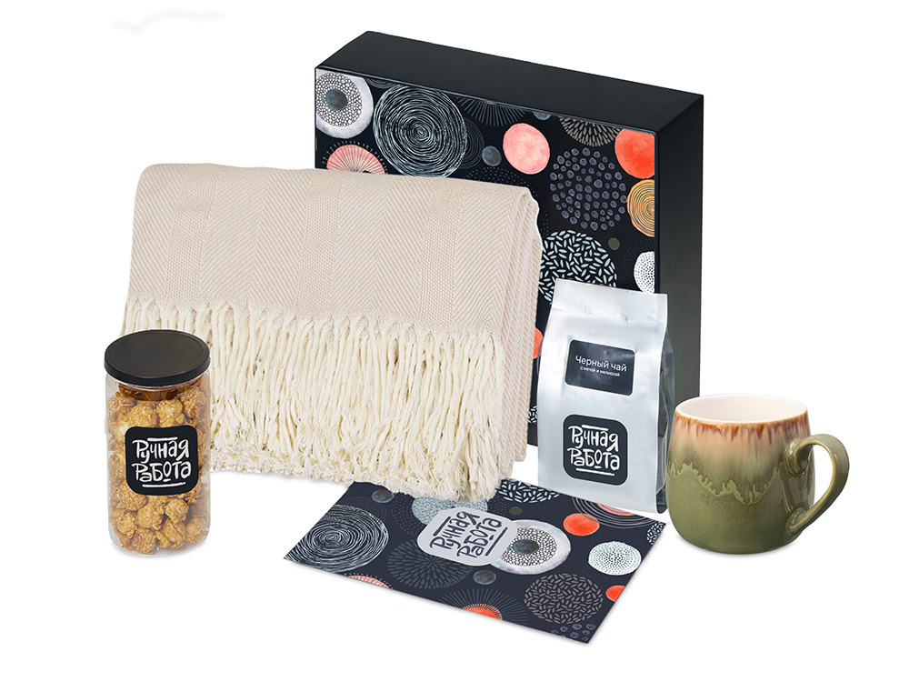 | Материал товара | плед - 100% хлопок, кружка - костяной фарфор с покрытием софт-тач, чай - пластик, попкорн - пластик, металл, мешок - нетканый материал (спанбонд), коробка - картон |