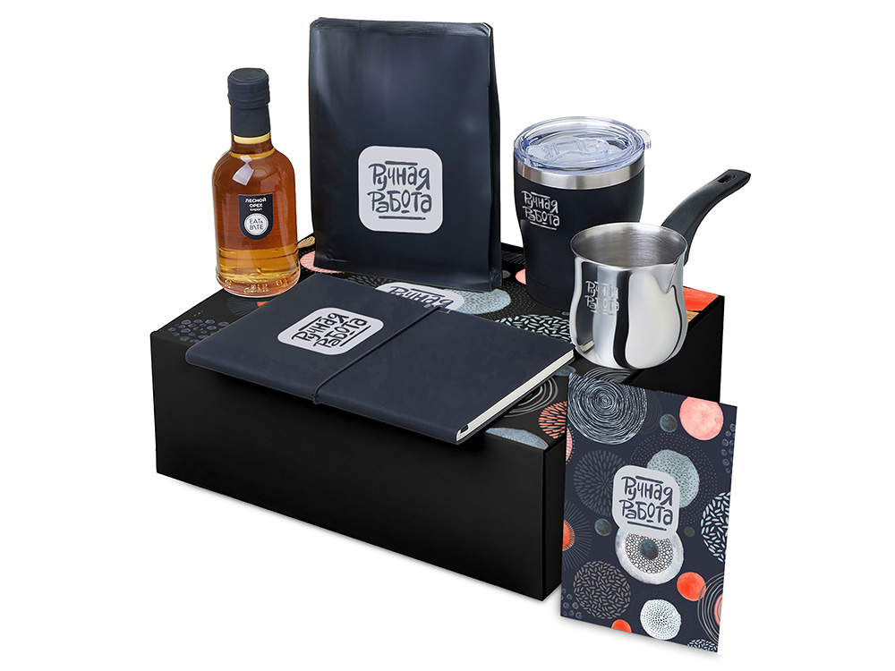 | Материал товара | сироп - стекло, блокнот - искусственная кожа, бумага, турка - нержавеющая сталь, бакелит, кофе - пластик, термокружка - нержавеющая сталь, керамика, полипропилен, мешок - нетканый материал (спанбонд), коробка -картон |
