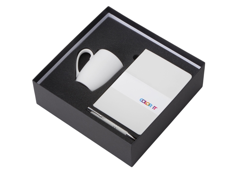 Color It — линейка, в которую входят хиты мерча в десяти самых популярных цветах. Еще никогда собрать сет под свой брендбук не было так просто. Широкая цветовая палитра серии позволяет создать идеальный набор в едином оттенке Pantone. Все товары имеют тактильно приятное покрытие софт-тач. Сет поставляется в коробке: мы продумали все, включая подарочную упаковку, за вас — осталось нанести лого! Фарфоровая кружка с удобной ручкой брендируется методом гравировки, поэтому нанесение будет долговечным и не сотрётся при мытье кружки. Бизнес-блокнот в твёрдой обложке имеет ляссе в тон обложки и среза. Бумажный блок разлинован в линейку и выполнен из бумаги, полученной из древесины из специальных восполняемых лесных ресурсов, имеет сертификат FSC. Шариковая ручка имеет сменный стержень, поэтому такой мерч прослужит дольше обычной одноразовой ручки, долго напоминая о вас клиентам. - объём кружки: 300 мл; - блокнот А5 128 листов; - ручка с необычным слайдером; - подарочная упаковка из картона, оклеенного дизайнерской бумагой уже включена в набор