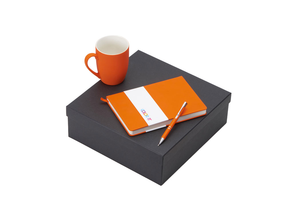 Color It — линейка, в которую входят хиты мерча в десяти самых популярных цветах. Еще никогда собрать сет под свой брендбук не было так просто. Широкая цветовая палитра серии позволяет создать идеальный набор в едином оттенке Pantone. Все товары имеют тактильно приятное покрытие софт-тач. Сет поставляется в коробке: мы продумали все, включая подарочную упаковку, за вас — осталось нанести лого! Фарфоровая кружка с удобной ручкой брендируется методом гравировки, поэтому нанесение будет долговечным и не сотрётся при мытье кружки. Бизнес-блокнот в твёрдой обложке имеет ляссе в тон обложки и среза. Бумажный блок разлинован в линейку и выполнен из бумаги, полученной из древесины из специальных восполняемых лесных ресурсов, имеет сертификат FSC. Шариковая ручка имеет сменный стержень, поэтому такой мерч прослужит дольше обычной одноразовой ручки, долго напоминая о вас клиентам. - объём кружки: 300 мл; - блокнот А5 128 листов; - ручка с необычным слайдером; - подарочная упаковка из картона, оклеенного дизайнерской бумагой уже включена в набор