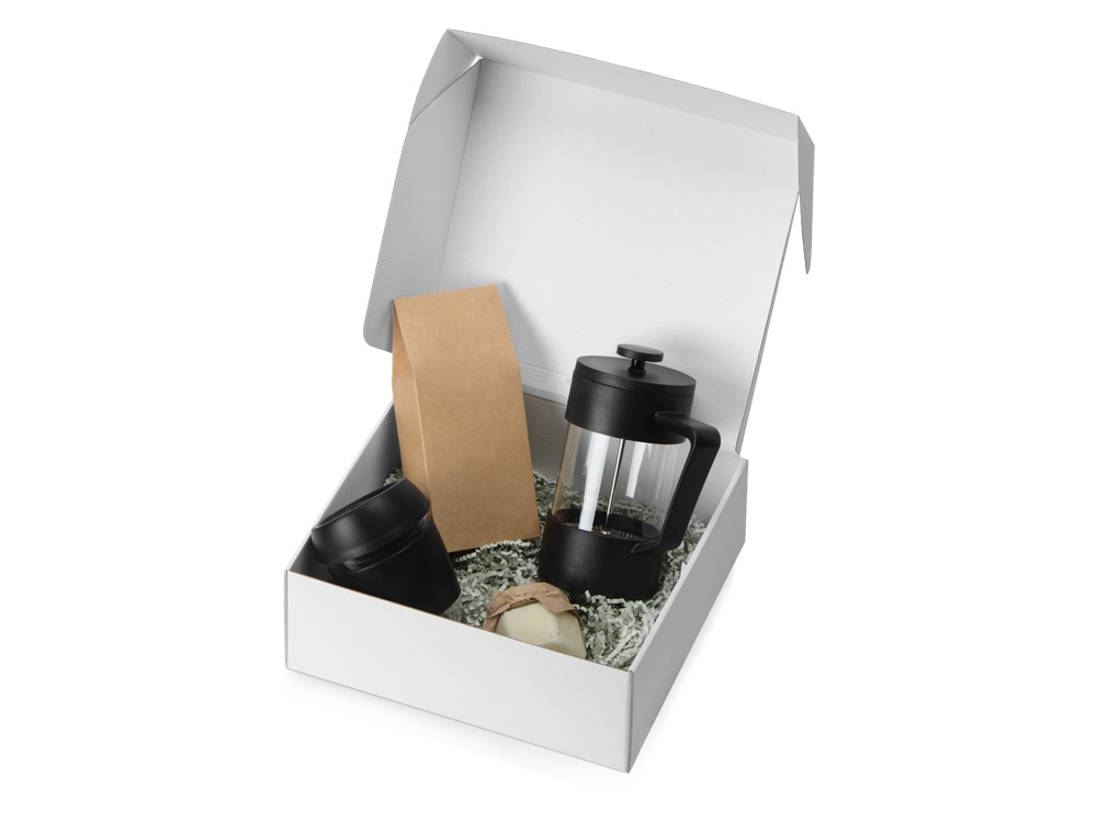 Набор Бодрое утро содержит все необходимое для действительно приятного пробуждения. В нем вы найдете все, что нужно для приготовления вашей первой чашечки кофе с утра: френч-пресс, упаковку робусты темной обжарки, стакан с силиконовыми деталями и баночку крем-меда, который составит прекрасную пару крепкому напитку. Набор упакован в белую картонную коробку и переложен бумажным наполнителем.