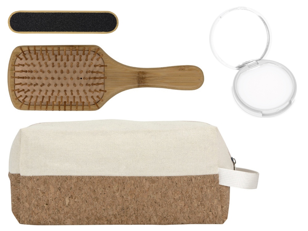 Материал товара расческа, пилка для ногтей - бамбук, бальзам для губ -пластик, несессер - хлопок, пробка, ручка - полиэстер