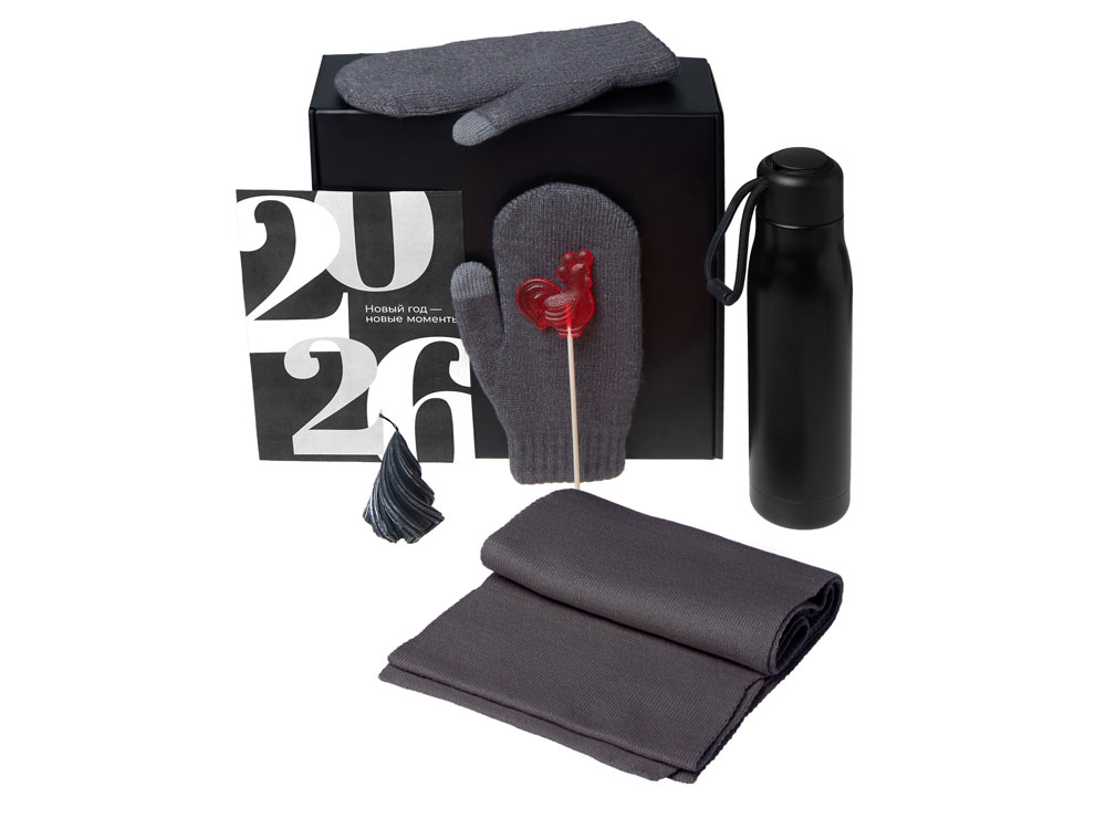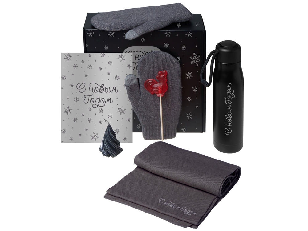 Подарочный набор с варежками, шарфом и термосом, серый