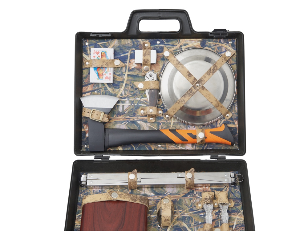 Идеальный комплект для активного отдыха на природе. Этот универсальный набор включает в себя все необходимое для комфортного пикника или кемпинга, обеспечивая вам удобство и стиль. В комплекте: - Тарелки (нерж. сталь)- 6 шт - Вилки (нерж. сталь)- 6 шт - Ложки (нерж. сталь)- 6 шт - Стопки (нерж. сталь)- 6 шт - Воронка для разлива - Топорик - Нож складной - Зажигалка - Складной мангал - Шампура- 6 шт - Фляжка - Колода игральных карт Все аксессуары упакованы в пластиковый кейс и надежно закреплены ремешками из натуральной кожи, что обеспечивает удобство транспортировки и сохранность содержимого.
