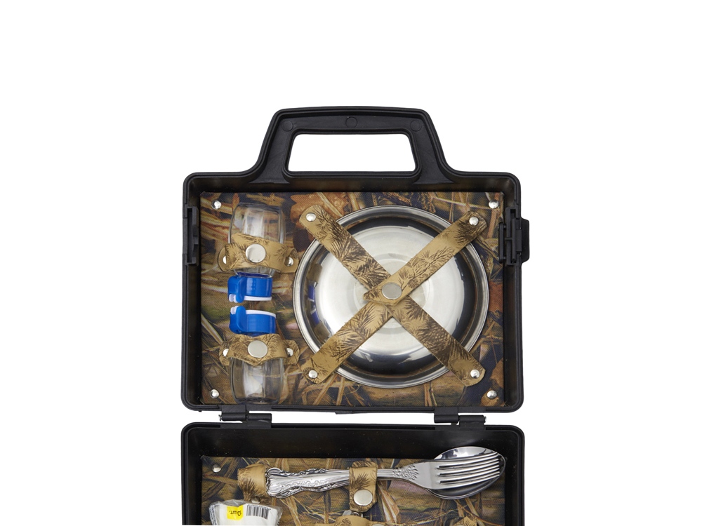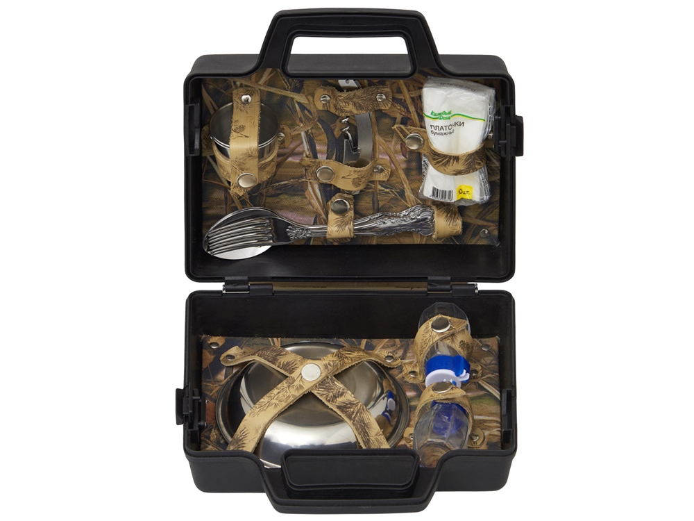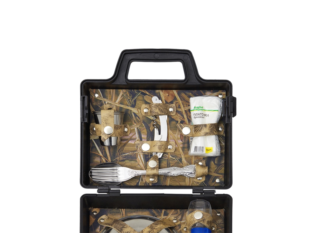 Подарочный набор для пикника. Этот тщательно подобранный комплект идеально подходит для тех, кто ценит качество и удобство во время отдыха на природе. В комплекте: - Тарелки (нерж. сталь)- 2 шт - Вилки (нерж. сталь)- 2 шт - Ложки (нерж. сталь)- 2 шт - Стопка (нерж. сталь)- 2 шт - Штопор- 1 шт - Емкости для соли и перца- 2 шт. - Платочки бумажные- 1 уп. Все аксессуары упакованы в пластиковый кейс и надежно закреплены ремешками из натуральной кожи, что обеспечивает удобство транспортировки и сохранность содержимого.