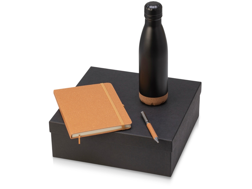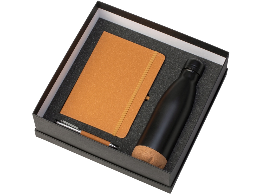 Набор из блокнота, ручки и бутылки для воды - идеальный вариант для подарка сотрудникам или клиентам. Термобутылка имеет медный слой между стенками, который позволяет ей удерживать температуру до 24 часов. Нижняя часть бутылки выполнена из экологичной пробки, которая не даёт скользить по столу или царапать его. Блок блокнота - бежевого цвета с линовкой в линейку. Твёрдая обложка выполнена из переработанной кожи, как и вставка на ручке. Ручка изготовлена из переработанной стали и оснащена стержнем с эко-чернилами, при производстве которых не выделяется вредных веществ. объём термобутылки: 460 мл; блокнот с резинкой; мерч с заботой об экологии.