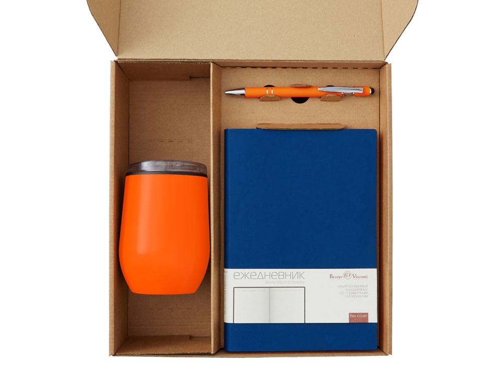 Материал товара ежедневник - искусственная кожа, термокружка - нержавеющая сталь снаружи, полипропилен внутри, ручка - металл c покрытием soft-touch, ситечко - нержавеющая cталь