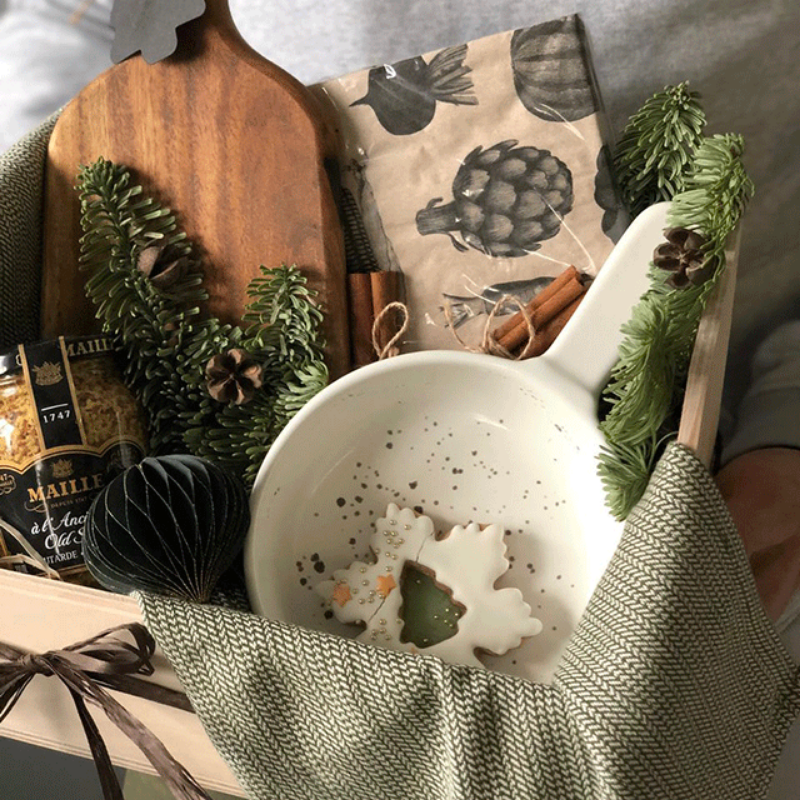 | Состав | сервировочные салфетки, сковородка из керамики ручной работы, сервировочная доска, зернистая горчица, имбирный пряник ручной работы, елочная игрушка, веточки нобилиса |