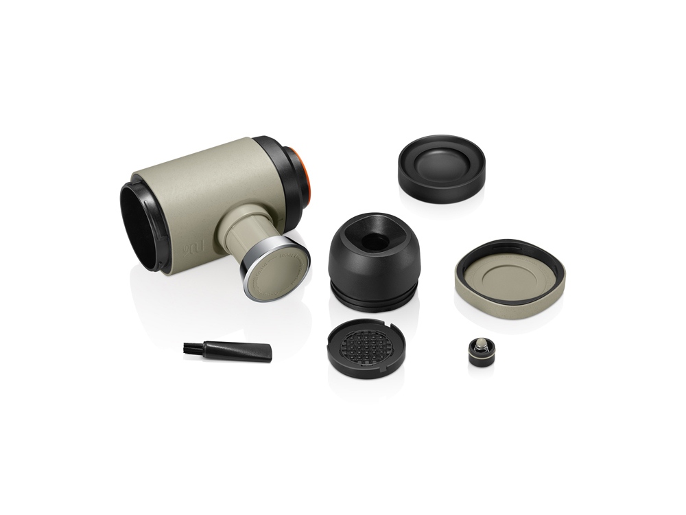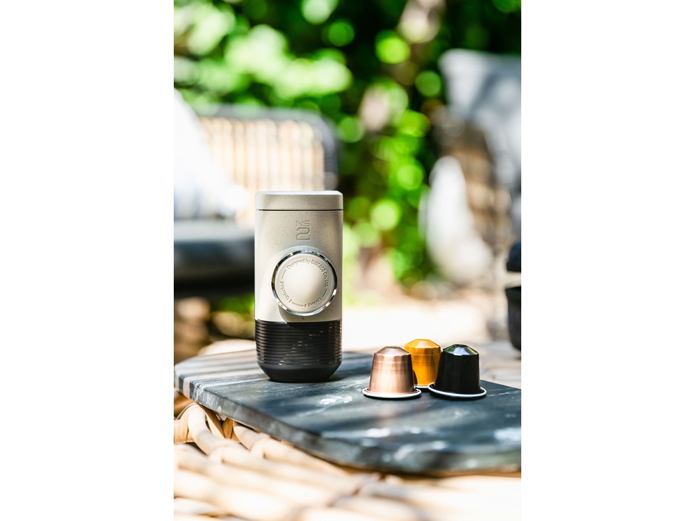 Ручная капсульная портативная кофемашина WACACO Minipresso NS2. В комплект входит: кофеварка, мягкая сумка-чехол, встроенная емкость для эспрессо 80 мл, портафильтр, кисточка для очистки. Кофеварка оснащена мощной насосной системой для создания высокого давления в 18 бар, вес 290 гр.