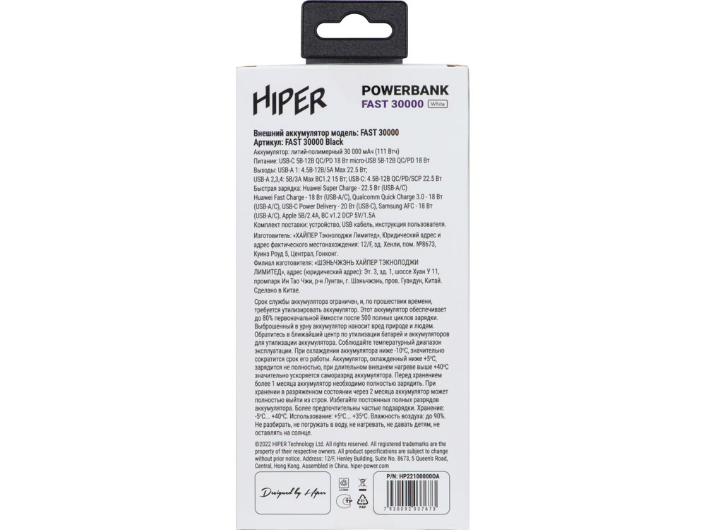 Портативный внешний аккумулятор HIPER FAST 30000 емкостью 30000 мАч (111Втч) оснащён двунаправленным портом USB-C, Micro-USB входом для зарядки, с поддержкой быстрой зарядки аккумулятора QC и PD, 4xUSB-A выходами, максимальный выходной ток 5А, максимальная мощность 22,5 Вт, поддержка быстрой зарядки стандарта QC 18 Вт, поддержка быстрой зарядки стандарта PD 18 Вт, стильный дизайн.