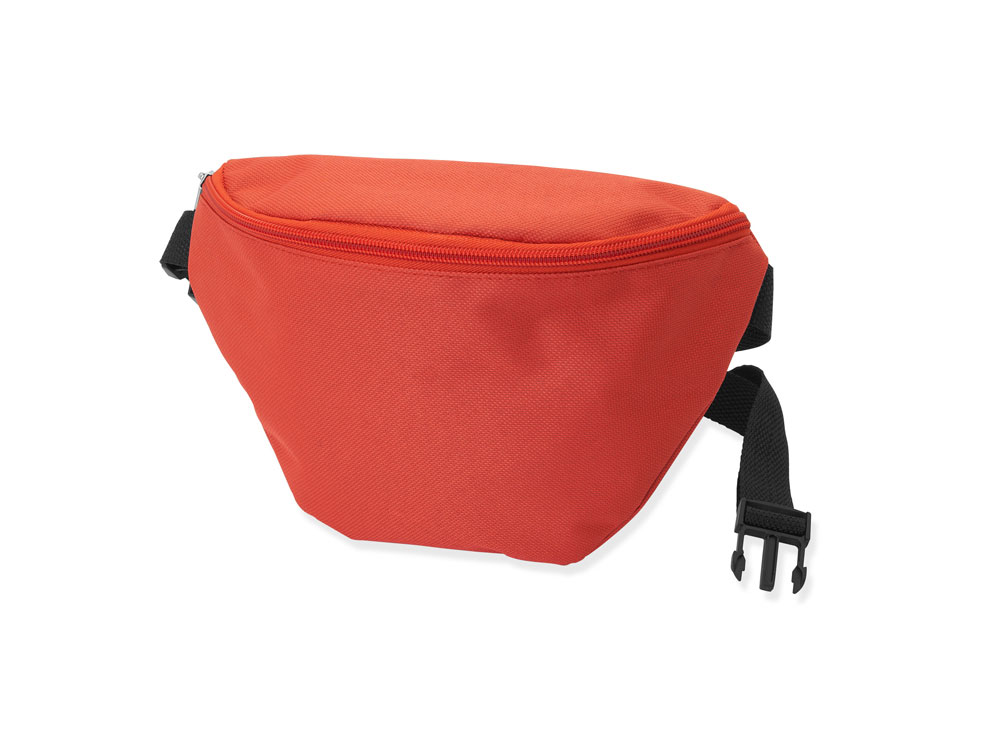 Поясная сумка с передним и задним карманом. Цветные молнии и ручки в тон поясной сумке. Черный ремешок и регулируемая застежка.