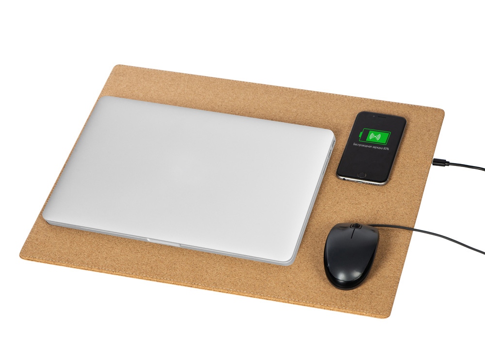 Большой (45 х 40 см) коврик из пробки для мышки, который может заряжать Qi-совместимые устройства методом беспроводной зарядки. Коврик позволяет разместить не только мышку, но и небольшой ноутбук или планшет. Коврик решает проблему скольжения мышки, обеспечивает бесшумное перемещение мыши по поверхности, позволяет декорировать интересным способом рабочее место. В комплекте длинный зарядный кабель 100 см. Коврик не складывается. - беспроводная зарядка на 5 Вт - разъем micro USB - большой размер поля для нанесения - кабель 100 см в комплекте