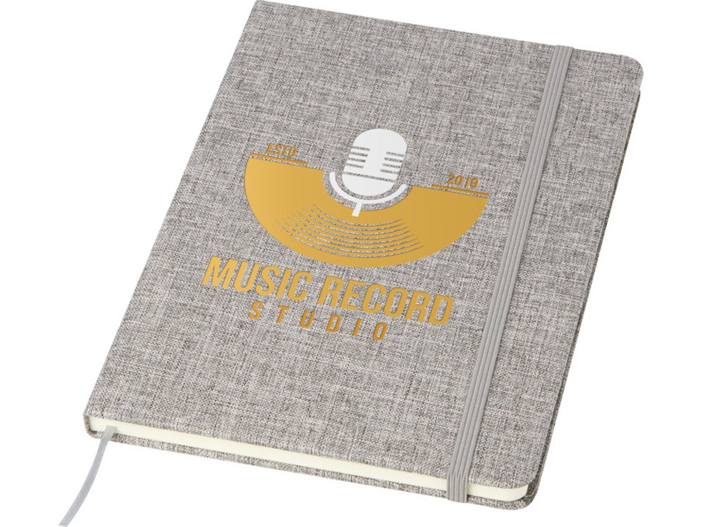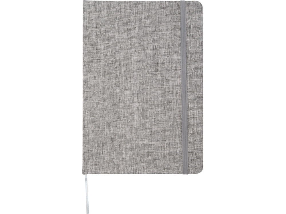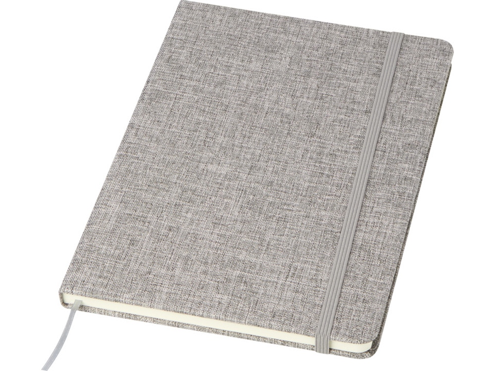 Блокнот формата А5 в твердой обложке из переработанного хлопка, 80 листов бумаги плотностью 70 г/м² в линейку. Блокнот имеет эластичную застежку, ленту и закругленные углы. FSC certified paper. FSC Mix Credit P7.1 CU-COC-877277.