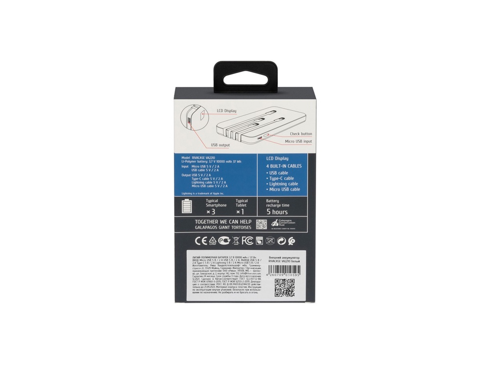 RIVACASE VA2210 (10000 мАч) внешний аккумулятор с дисплеем и встроенными кабелями, белый, 12/48