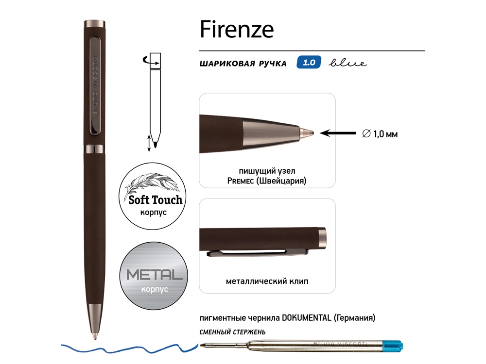 Шариковая металлическая ручка из коллекции Firenze от Bruno Visconti - бизнес-аксессуар, с которым вы всегда будете чувствовать себя уверенно и комфортно. Лаконичный дизайн, прочный металлический корпус, строгость формы подчеркнут статус владельца ручки. Удобство в эксплуатации и тактильно приятные ощущения подарит бархатистое покрытие Soft Touch. Ручка автоматическая, с легким поворотным механизмом подачи стержня. Надежный пишущий узел d 1,0 мм (от швейцарского производителя Premec) гарантирует высокое качество также, как и пигментные чернила Dokumental (Германия). Благодаря им писать ручкой Firenze одно удовольствие – она мягко скользит по поверхности бумаги, оставляя ровную, четкую линию.