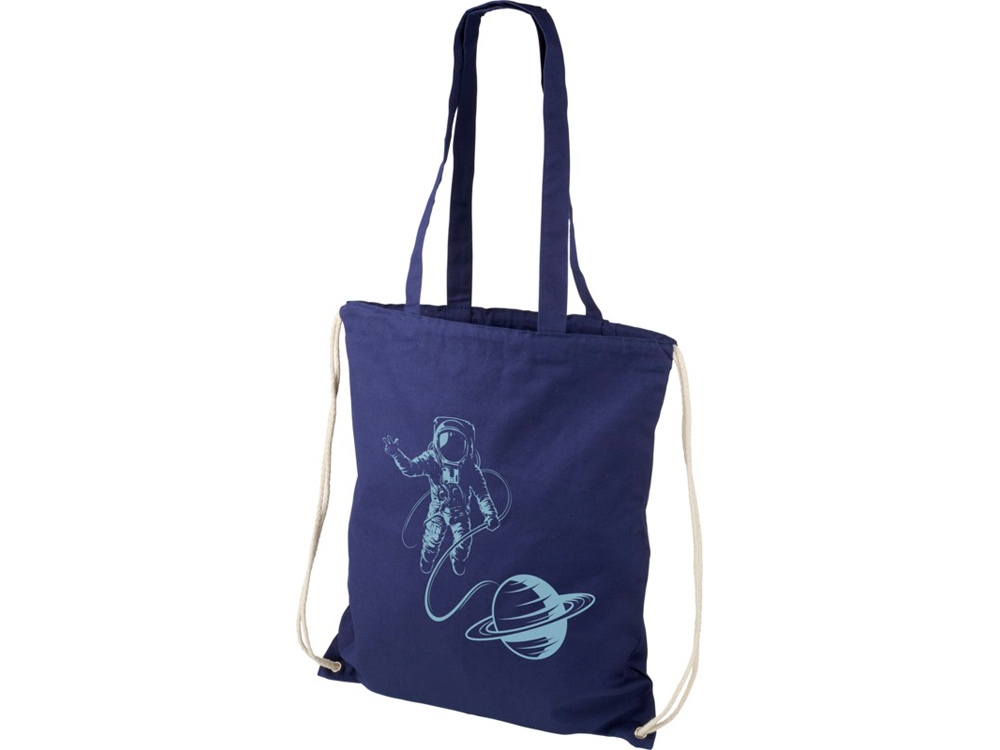 Многофункциональный хлопчатобумажный мешок с длинными ручками и затягивающим шнурком, который можно носить в качестве сумки для покупок или рюкзака. Большой основной отсек, закрывающийся затяжкой шнурка. Имеет две выпадающие ручки длиной 31 см. Вместимость: 16 л, выдерживает до 5 кг веса. Хлопок, 240 g/m2.