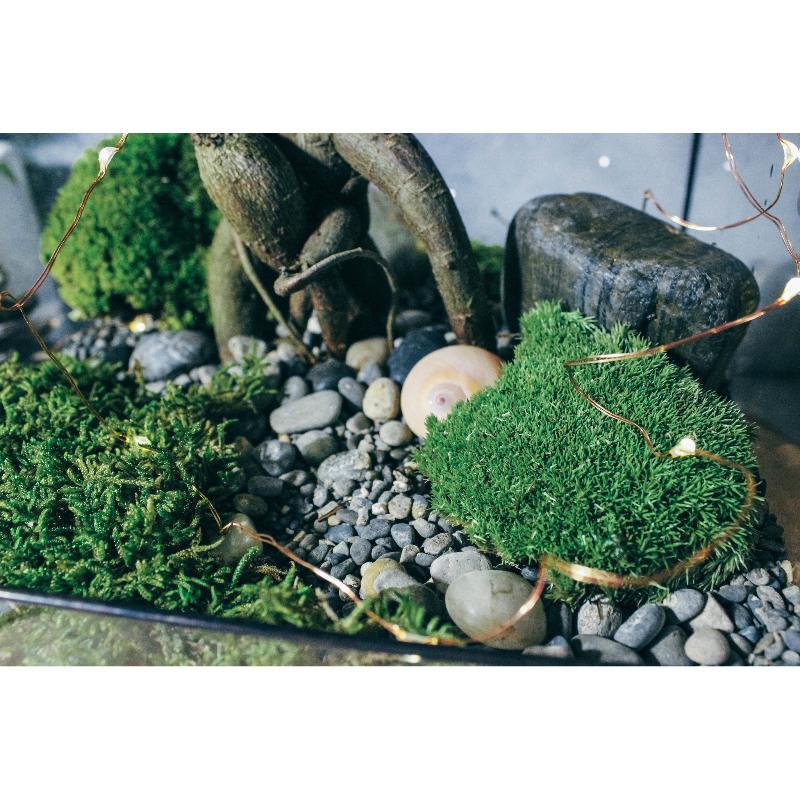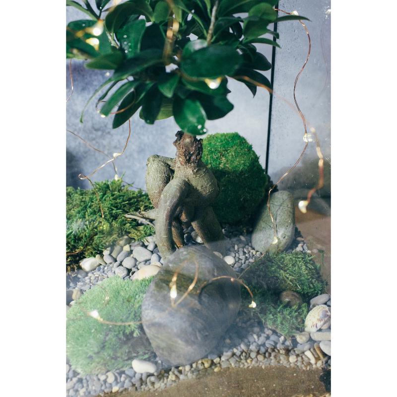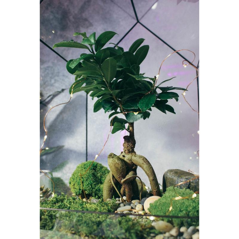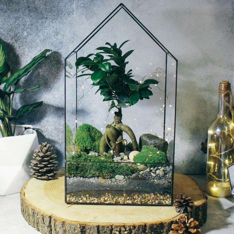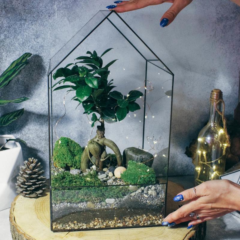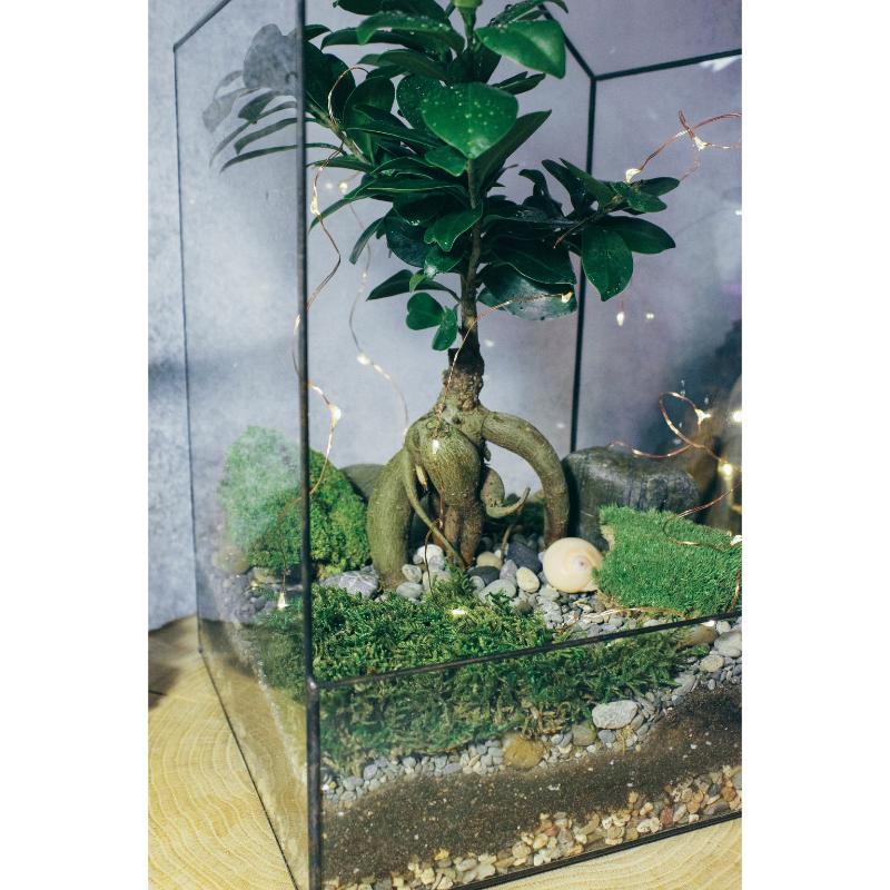 • Представьте себе уютный сад, заключенный в прозрачные стены стеклянного домика. Этот миниатюрный оазис природы радует глаз и создает атмосферу спокойствия. В центре композиции находится великолепный бонсай, символизирующий гармонию и вечность.