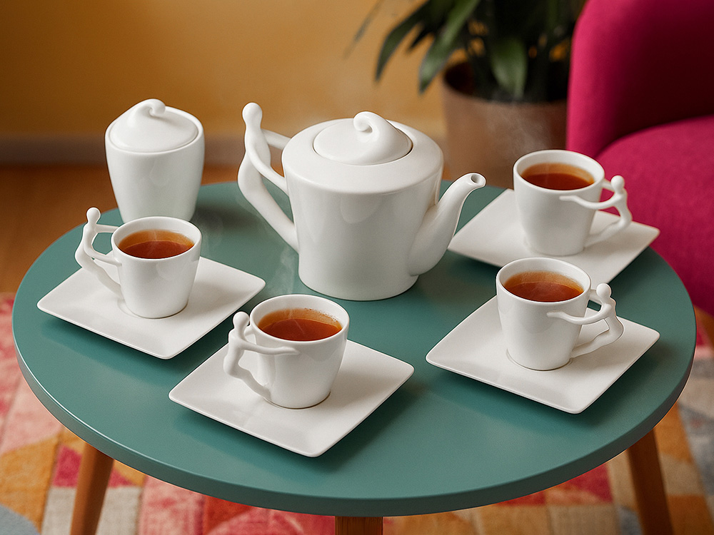Это не просто посуда, а настоящее произведение искусства для вашего стола. Белоснежный сервиз создан для тех, кто ценит не только вкус, но и эстетику каждого момента. Уникальный дизайн: Ручки чашек и чайника выполнены в виде стилизованной фигуры человека. Это придает сервизу особый характер и глубину, превращая процесс чаепития в диалог с искусством. Полный комплект: В набор входит все необходимое: 4 чашки, 4 блюдца, чайник и сахарница. Эксклюзивная упаковка: Сервиз поставляется в деревянной коробке. Вы можете нанести на нее логтип или памятную надпись. Это готовая идея для безупречного корпоративного подарка. Универсальность и стиль: Белоснежный цвет и лаконичный дизайн делают сервиз уместным в любом интерьере — от классики до модерна.