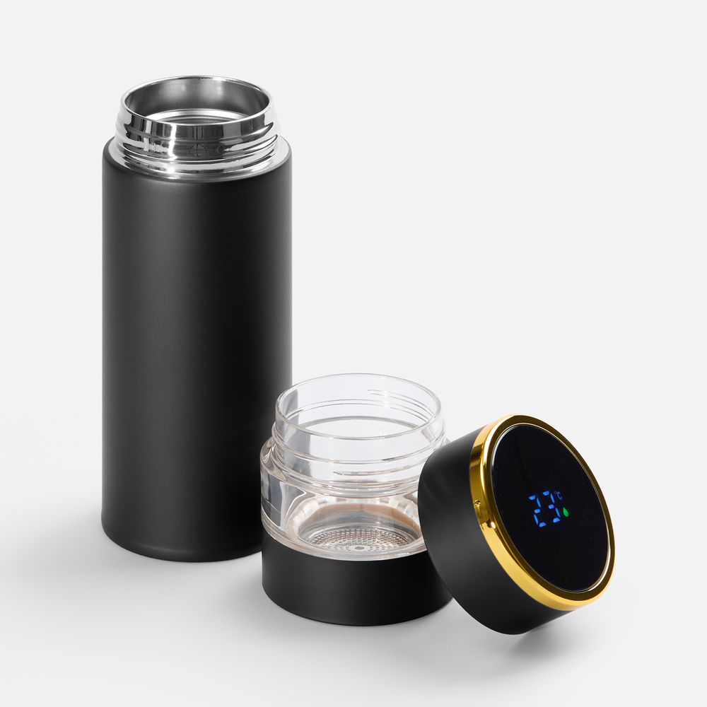 Умная термобутылка для заваривания Thermory отображает температуру жидкости на ЖК-дисплее — точные данные собирает встроенный в крышку датчик. Стенки из нержавеющей стали и вакуумная изоляция корпуса сохраняют напитки горячими (60 °C) в течение 8 часов или прохладными (10 °C) в течение 12 часов.