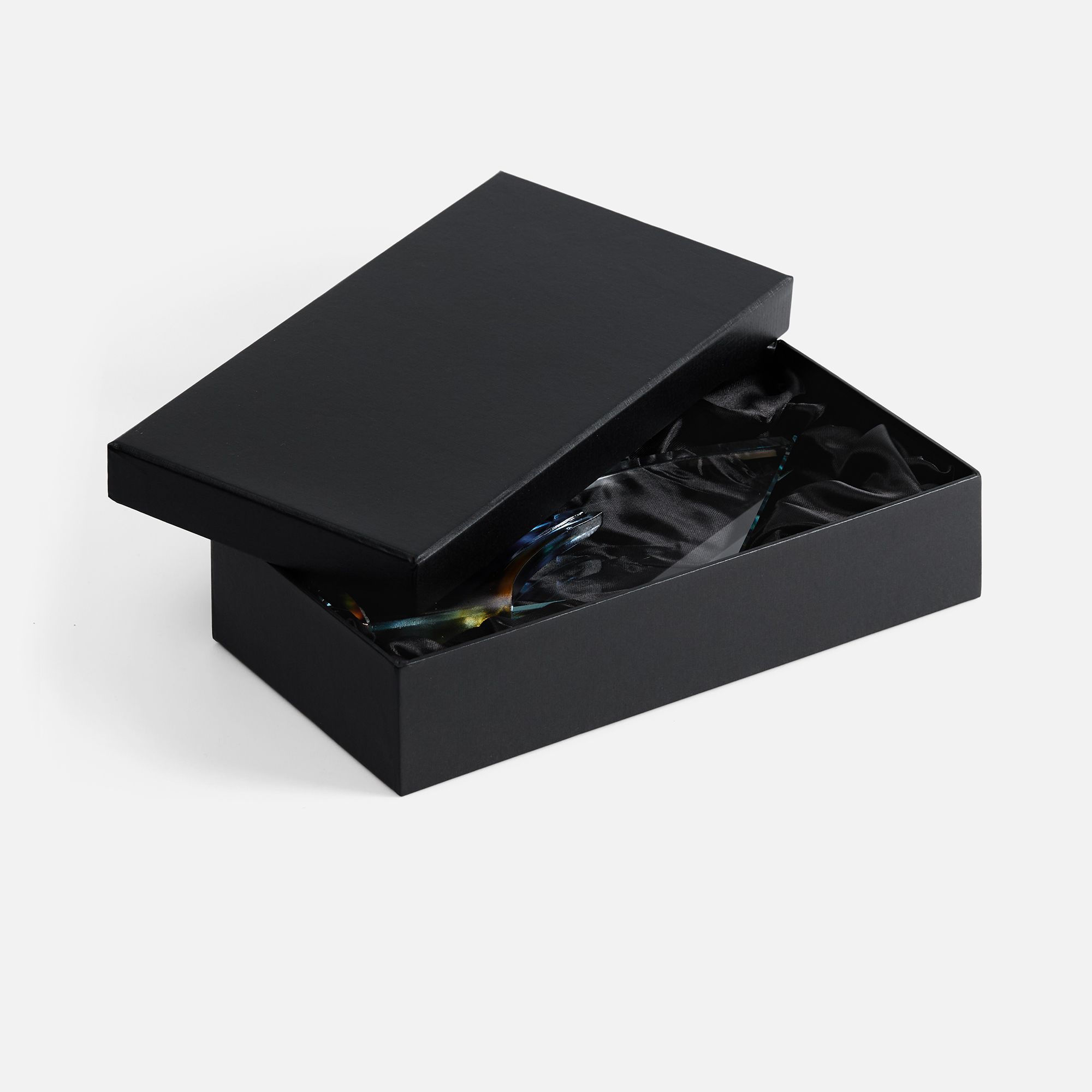 Стела изготовлена из стекла К9, в основе которого лежит оптическое боросиликатное стекло. Эту марку стекла отличает низкий процент посторонних включений, высокий показатель преломления и высокая прозрачность — идеальные качества для изготовления наград премиального уровня.
