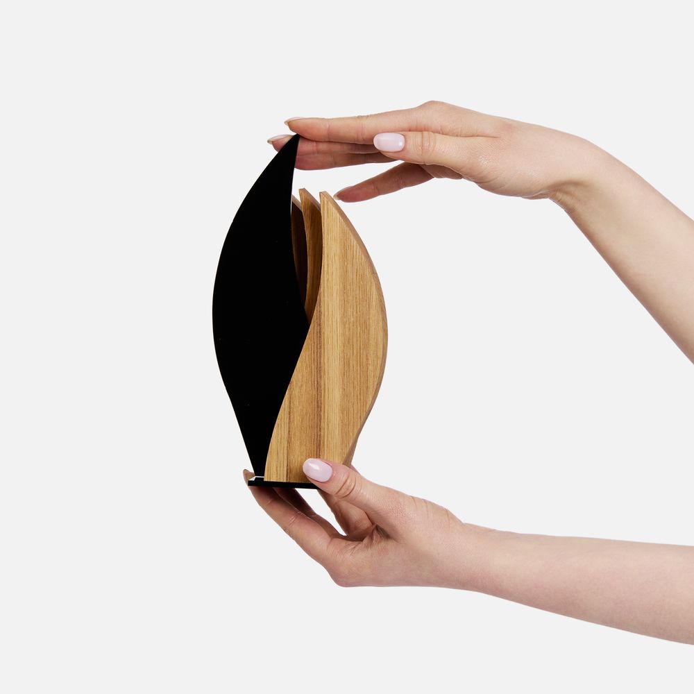 Благородный ясень, символизирующий непобедимость, прекрасно сочетается с глянцевой акриловой вставкой — получается эффектное и запоминающееся сочетание. Пусть эта награда зажжет искру вдохновения и поддержит огонь успеха коллег, партнеров и друзей.