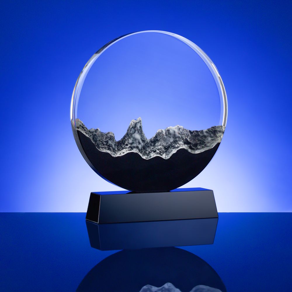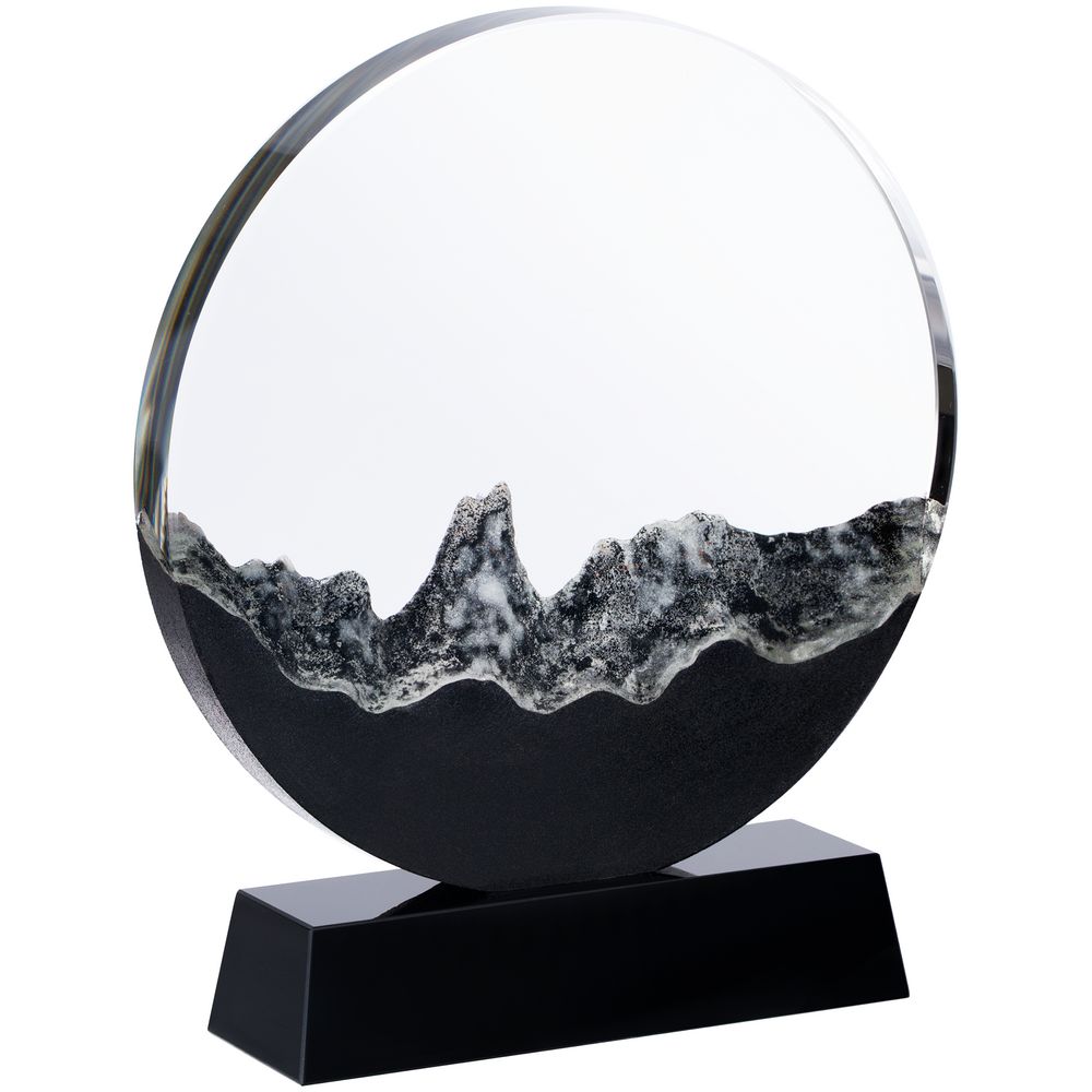 Прозрачная круглая часть и черное основание стелы изготовлены из премиального стекла К9, в основе которого лежит оптическое боросиликатное стекло. Эту марку стекла отличает низкий процент посторонних включений, высокий показатель преломления и высокая прозрачность — идеальные качества для изготовления наград премиального уровня.
