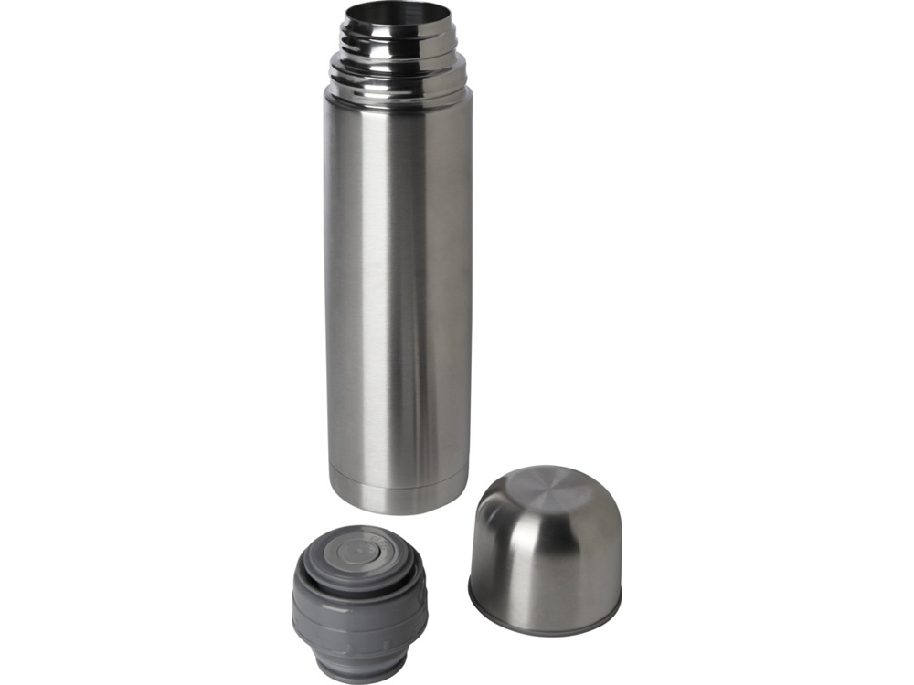 Изолированная колба с двойными стенками и крышкой, сертифицированная RCS. Кнопочный носик, управляемый одной рукой, который автоматически закрывается при привинчивании крышки-чашки к бутылке. Объем 750 мл. Recycled stainless steel.