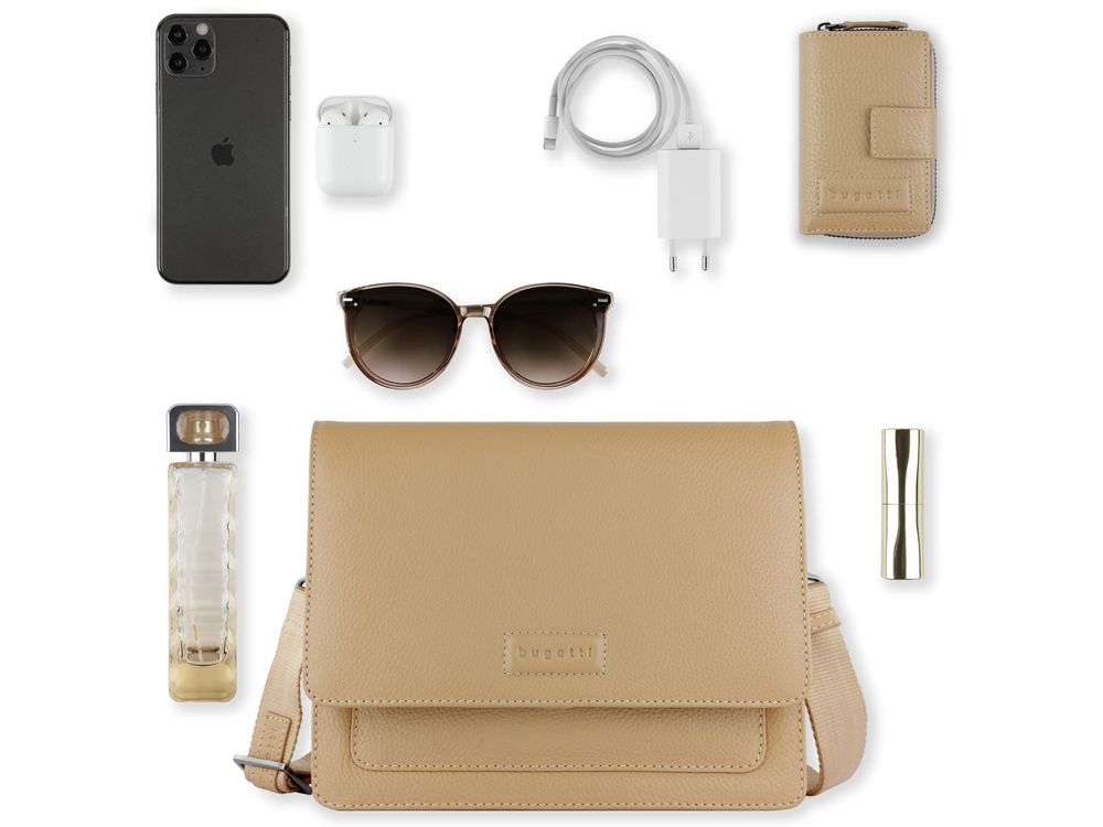 ЖЕНСКАЯ СУМКА ЧЕРЕЗ ПЛЕЧО ELSA Готовы к поездке в выходные? Мы раскрасим вашу ленту в соцсетях невероятной коллекцией ELSA. Коллекция ELSA предлагает широкий ассортимент аксессуаров и сумок разных форм и размеров, от элегантных кошельков и изящных наплечных сумочек для выхода в свет до вместительных шопперов и дорожных сумок для путешествий. Все модели серии изготовлены из высококачественной мягкой воловьей кожи и представлены в классическом черном, белом и бежевом цветах. Элегантное тиснение логотипа Bugatti придает очарование каждой модели. Коллекция выделяется продуманной функциональной организацией внутреннего пространства и защитой от радиочастотной идентификации RFID. Кошельки и ключницы оснащены специальным защитным слоем из фольги, который предотвращает незаконное сканирование вашей личной информации и препятствует списанию денежных средств с банковских карт. Какой бы аксессуар или сумку вы бы ни предпочли, будьте уверены, что с коллекцией ELSA вы точно окажетесь в центре внимания. СВОЙСТВА Функциональная организация: основное отделение на магнитной кнопке с карманом на молнии и открытым карманом, передний открытый карман, задний карман на молнии, съемный регулируемый плечевой ремень (до 130 см). Материал: воловья кожа/полиэстер Размер: 25 х 8,5 х 20 см Вес: 0,54 кг