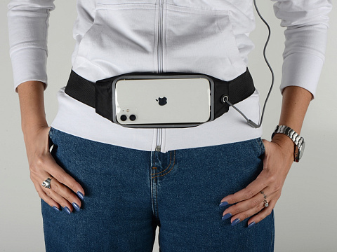 Сумка на пояс с отделением для смартфона размером до 16 х 8 см и выходом для наушников.