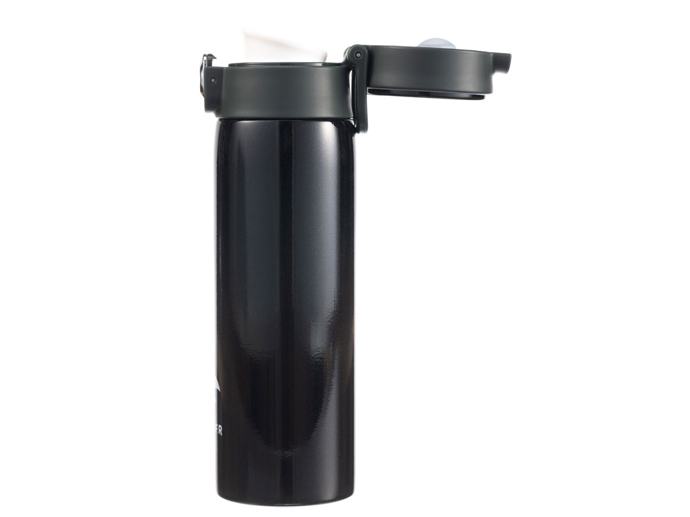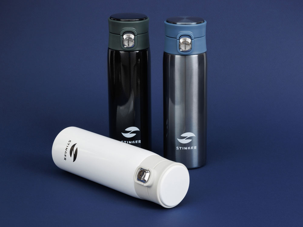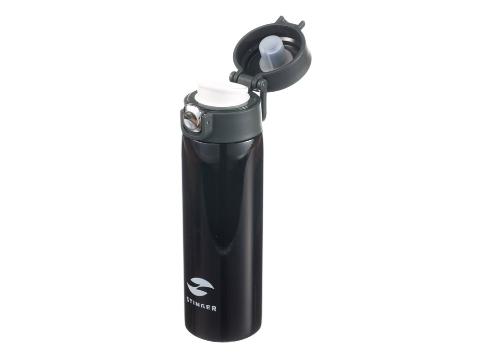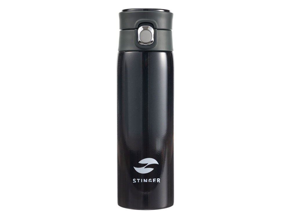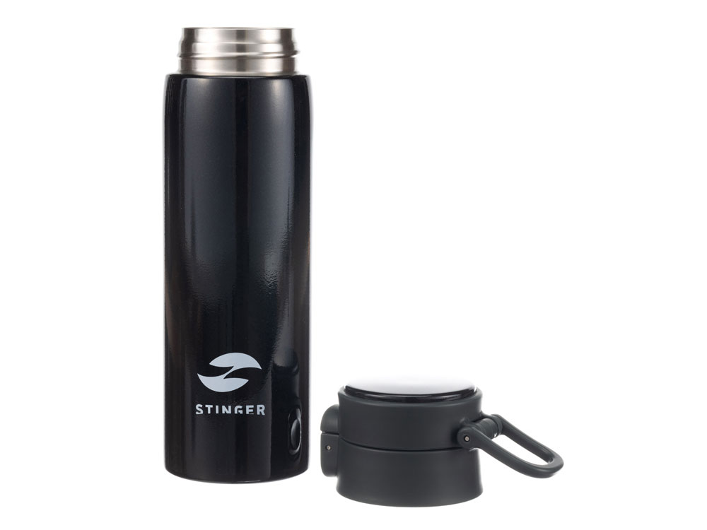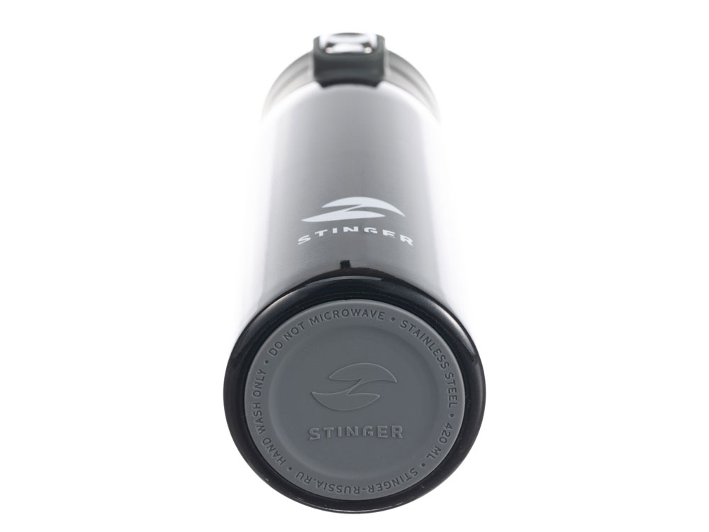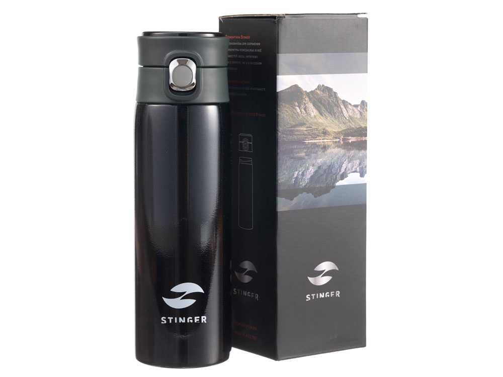 СВЕРХЛЕГКАЯ ТЕРМОКРУЖКА STINGER 0,42 л НАЗНАЧЕНИЕ Термокружка STINGER предназначена для употребления пищевых жидкостей (воды, напитков) как в горячем, так и в холодном состоянии. ХАРАКТЕРИСТИКИ Объём: 0,42 л Вес: 0,231 кг Время сохранения тепла: 6 часов Время сохранения холода: 6 часов Метод изоляции: вакуум Размеры • Высота – 21,9 см • Диаметр горлышка – 4,7 см • Диаметр дна – 6,5 см • Ширина (с учетом кольца и фиксатора) – 7,5 см Тип крышки: винтовая крышка-пробка с откидным механизмом Цвет: черный Материалы • Корпус: медицинская нержавеющая сталь, класс AISI 316 Stainless Steel • Колба: медицинская нержавеющая сталь, класс AISI 316 Stainless Steel • Крышка: пищевой пластик, не содержит бисфенол А (BPA free) • Прокладки-уплотнители: пищевой силикон ОСОБЕННОСТИ • Двойные стенки с вакуумной изоляцией отлично сохраняют температуру долгое время, гарантируют безопасность прикосновения к очень горячим и холодным напиткам. • Внешний и внутренний корпус из прочной медицинской нержавеющей стали AISI 316. • Пластиковые детали не содержат Бисфенол А (BPA FREE). • Герметичная крышка и дополнительный фиксатор защищают от случайного открывания и проливания жидкости. • Конструкция крышки позволяет открывать термокружку в одно касание и одной рукой – достаточно нажать на кнопку, верхняя крышка откинется на 180 градусов и автоматически зафиксируется в открытом положении. • Силиконовая накладка на дне предотвращает случайное скольжение и опрокидывание. • Ситечко для заварки чая или кофе. • Кольцо для удобства переноски. • Подходит под все виды подстаканников.