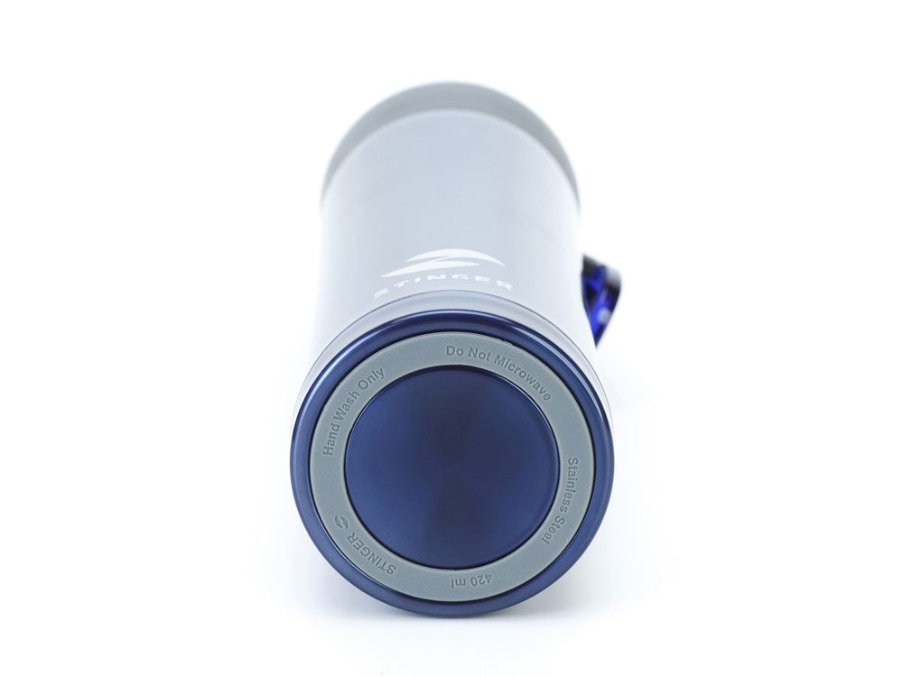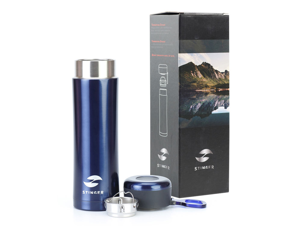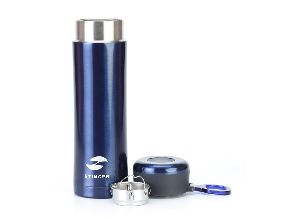 ТЕРМОКРУЖКА STINGER 0,42 Л СВОЙСТВА: Тип термоса: для горячих и холодных напитков Материал корпуса: двухслойная нержавеющая пищевая сталь 18/8 Тип крышки: закручивающаяся Материал крышки: пластиковая без бисфенола А (BPA free) Объём термоса: 0,42 л Размер термоса: 7,5 х 6,9 х 22,2 см Вес термоса: 346 г Цвет: синий металлик ХАРАКТЕРИСТИКИ: Сохраняет температуру: Горячий напиток: через 6 часов температура наполняемой жидкости 71℃ Холодный напиток: через 6 часов температура наполняемой жидкости 7,5 ℃ ОСОБЕННОСТИ: Ситечко для заварки чая или кофе Кольцо для удобства переноски Подходит под любые автомобильные подстаканники