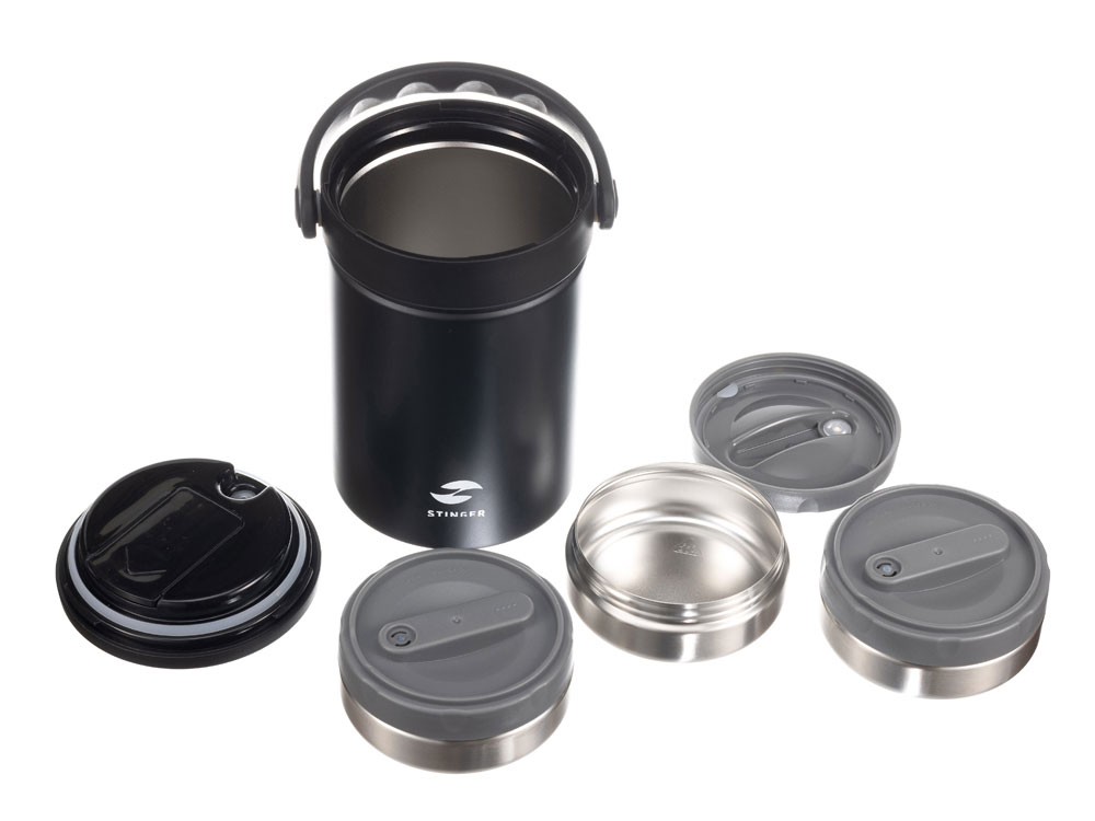ТЕРМОС ЛАНЧ-БОКС STINGER 1,7 л НАЗНАЧЕНИЕ Термос ланч-бокс STINGER предназначен для сохранения температуры помещаемых в него готовых блюд как в горячем, так и в холодном состоянии. ХАРАКТЕРИСТИКИ Объём: 1,7 л Вес: 1,196 кг Время сохранения тепла: 6 часов Время сохранения холода: 6 часов Метод изоляции: вакуум Размеры • Высота – 21,5 см • Диаметр горлышка – 13 см • Диаметр дна – 13 см • Ширина (с учетом ручки) – 16,1 см Тип крышки: винтовая крышка-пробка Тип горлышка: широкое Цвет: серебристый Материалы • Корпус: нержавеющая сталь, класс AISI 304 18/8 Stainless Steel • Колба: нержавеющая сталь, класс AISI 304 18/8Stainless Steel • Крышка: пищевой пластик, не содержит бисфенол А (BPA free) • Прокладки-уплотнители: пищевой силикон • Контейнеры: нержавеющая сталь, класс AISI 304 18/8 Stainless Steel, пищевой пластик, не содержит бисфенол А (BPA free) • Складная ложка: нержавеющая сталь, класс AISI 304 18/8 Stainless Steel ОСОБЕННОСТИ • Двойные стенки с вакуумной изоляцией отлично сохраняют температуру долгое время, гарантируют безопасность прикосновения к очень горячим и холодным напиткам. • Внешний и внутренний корпус из прочной пищевой нержавеющей стали AISI 304 18/8. • Пластиковые детали не содержат Бисфенол А (BPA FREE). • Многослойные контейнеры (3 шт) из нержавеющей стали объемом 400 мл. • Складная ложка фиксируется в специальной нише крышки. • Герметичная винтовая пробка защищает от случайного открывания и проливания жидких блюд. • Широкая горловина для легкого наполнения и очистки. • Силиконовая накладка на дне предотвращает случайное скольжение и опрокидывание. • Эргономичная ручка для удобной переноски. • Идеально сохраняет вкус и аромат любимых блюд.