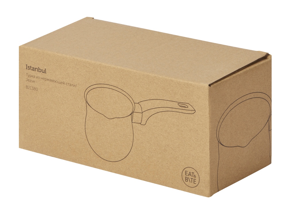 Турка от Eat&Bite с толстыми стенками позволит сварить настоящий ароматный напиток из любых сортов кофе, даже тех, что не подходят для кофемашин. А ещё приготовление кофе в турке — это целая завораживающая церемония, которая способна задать настроение на весь день. Ручка Istanbul выполнена из бакелита, благодаря чему она не нагревается. На абсолютно гладком корпусе из нержавеющей стали будет выгодно смотреться брендирование методом гравировки. А также этот материал не скапливает бактерии, устойчив к плесени и не вступает в реакцию с содержимым, благодаря чему не влияет на вкус и аромат напитка. Istanbul очень проста в уходе и использовании, но её нельзя мыть в посудомоечной машине и, как любую другую посуду из нержавейки, разогревать в микроволновой печи. • Лаконичный дизайн • Не нагревающаяся ручка из бакелита • Толстые стенки • Большая поверхность для нанесения • Подходит для всех типов плит • Объем 280 мл