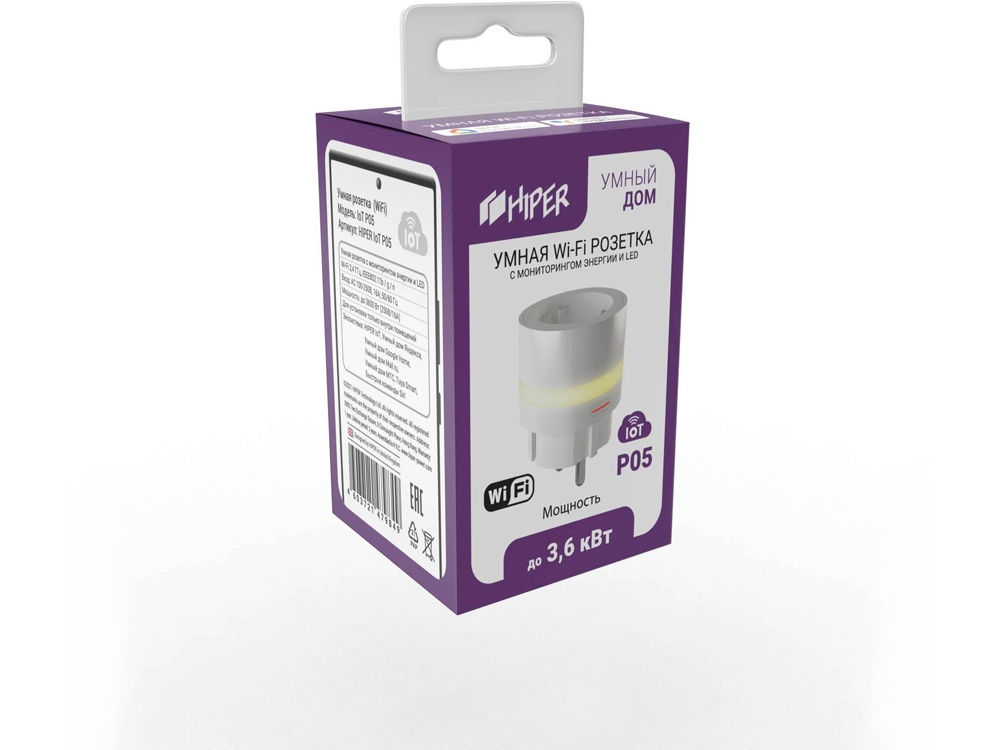 Умная розетка HIPER IoT P05 рассчитана на работу с мощными электроприборами (до 3,6 кВт), LED подсветкой корпуса и функцией мониторинга энергии. Предназначена для удаленного включения/выключения электроприборов, а также для поддержки исполняемых сценариев. К ключевым особенностям модели можно отнести: • Подходит для работы с мощными электроприборами. Максимально допустимая сила тока 16 А, мощность до 3,6 кВт. • Подсветка корпуса. Для удобства и безопасности, корпус розетки подсвечивается и ее легко обнаружить в темноте. • Поддержка голосовых помощников Яндекс Алиса и Google Home. Управлять включением/выключением данной розетки возможно через голосовых помощников в умной колонке, телефоне или планшете. • Установить и настроить просто. Чтобы установить эту розетку, достаточно ее воткнуть в действующую розетку и настроить в соответствии с инструкцией. • Удобство настройки сценариев HIPER IoT. Простая и интуитивно понятная настройка сценариев. • Поддержка облачных технологий. Благодаря облачным технологиям устройства умного дома от HIPER, могут работать без управляющих модулей, достаточно лишь подключить устройство к приложению и обеспечить доступ к Wi-Fi и Internet. • Безопасность и дистанционное включение/отключение. Для удаленного выключения/включения необходимо обеспечить подключение розетки к WiFi и смартфона/планшета к интернету. • Мониторинг потребляемой энергии. В приложении есть возможность отслеживать статистику потребления электроэнергии приборами, подключенными к данной розетке. • Включение/выключение по расписанию. Розетку можно включать и выключать по графику, в том числе по таймеру обратного отсчета и по расписанию. • Сохранение режима on/off при выключении электроэнергии. В случае отключения электричества, при появлении электроэнергии в сети, розетка сама восстановит тот режим, что был на момент выключения.