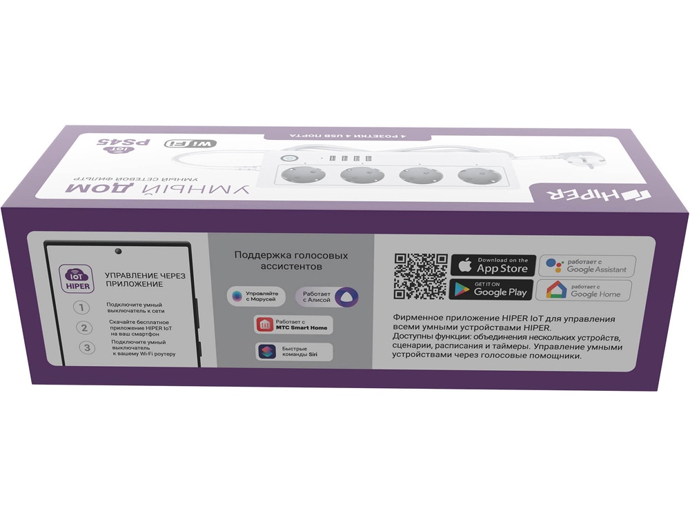 Умный сетевой фильтр рассчитан на работу с мощными электроприборами (общая мощность нагрузки до 3,6 кВт), оснащен 4 портами USB. Каждую розетку можно включать и выключать независимо, USB порты включаются и выключаются одновременно. Предназначен для удаленного независимого включения/выключения нескольких электроприборов, а также для поддержки исполняемых сценариев. К ключевым особенностям модели можно отнести: • Подходит для работы с мощными электроприборами. Максимально допустимая сила тока 16 А, мощность до 3,6 кВт. • Независимое включение и выключение устройств. Для удобства и безопасности, управляйте подключенными электроприборами независимо, это позволяет экономить энергию, а также более гибко настраивать умные сценарии. • Поддержка голосовых помощников Яндекс Алиса, Маруся (mail.ru), Apple Siri(быстрые сценарии), Умный Дом МТС и Google Home. Управлять включением/выключением устройств возможно через голосовых помощников в умной колонке, телефоне или планшете. • Установить и настроить просто. Чтобы настроить этот сетевой фильтр, достаточно подключить в обычную розетку и настроить подключение к Wi-Fi в соответствии с инструкцией. • Удобство настройки сценариев HIPER IoT. Простая и интуитивно понятная настройка сценариев. Несколько умных устройств HIPER IoT могут работать совместно, делая ваш дом еще умнее. • Поддержка облачных технологий. Благодаря облачным технологиям устройства умного дома от HIPER, могут работать без управляющих модулей, достаточно лишь подключить устройство к приложению и обеспечить доступ к Wi-Fi и Интернет. • Безопасность и дистанционное включение/отключение. Для удаленного выключения/включения необходимо обеспечить подключение к Wi-Fi и смартфона/планшета к Интернет, теперь по дороге на работу, не нужно переживать отключили ли вы утюг, достаточно зайти в приложение, проверить, и при необходимости выключить. • Включение/выключение по расписанию. Розетку можно включать и выключать по графику, в том числе по таймеру обратного отсчета и по расписанию.