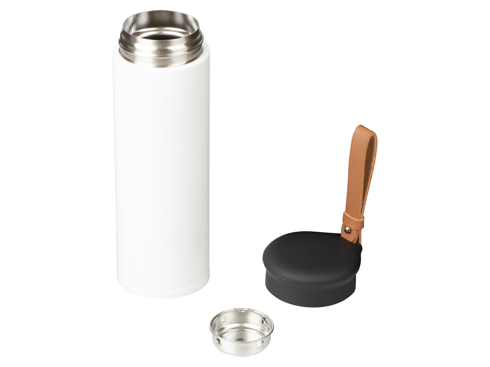 Engage — термос из долговечной нержавеющей стали с двойными стенками, вакуумная изоляция между которыми помогает сохранять температуру напитков в течение долгого времени. Термос идеально подходит для заваривания чая: специально для этого в комплекте идет металлическое ситечко с ручкой, которое не пропустит ни одной чаинки. Термос герметично завинчивается на крышку, оснащенную съемным ремешком из качественной ПУ кожи. Крышка имеет прорезиненное покрытие, что создает интересное сочетание текстур в рамках одной модели. Корпус имеет элегантную рельефную поверхность с антискользящим эффектом. - Удобный ремешок - Герметичная крышка soft-touch - Сохраняет тепло и холод до 18 часов - Пищевая долговечная сталь 304 марки - Оптимальный объем