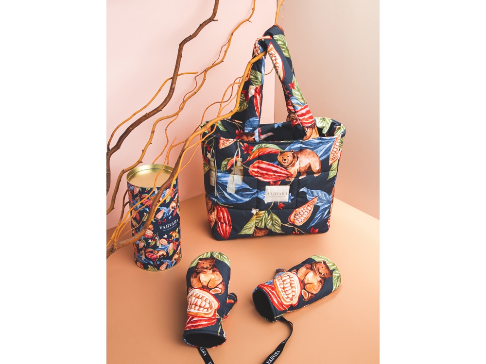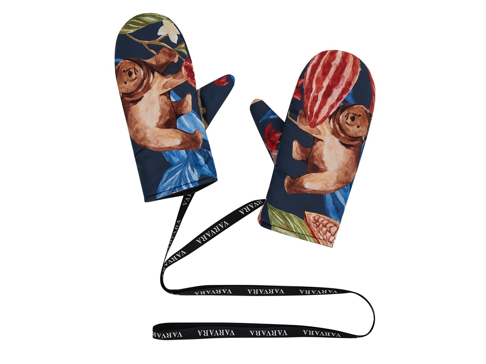 Утепленные варежки с принтом Мишки в шоколаде. Верхняя ткань выполнена из непромокаемой курточной ткани, внутри флисовый подклад и утеплитель - холлофайбер. Температурный режим до -20 градусов. Варежки на ленте, как в детстве. Принт Мишки в шоколаде продолжает серию сказочных принтов Varvara. Задорные медвежата прячутся в листьях и плодах вечнозеленого какао, создавая яркий, эмоциональный узор. Варежки упакованы в подарочный тубус. Бережный уход: - Ручная стирка при температуре не выше 30 градусов. - Сушка в горизонтальном положении. * фрагмент принта может отличаться от представленного на фото