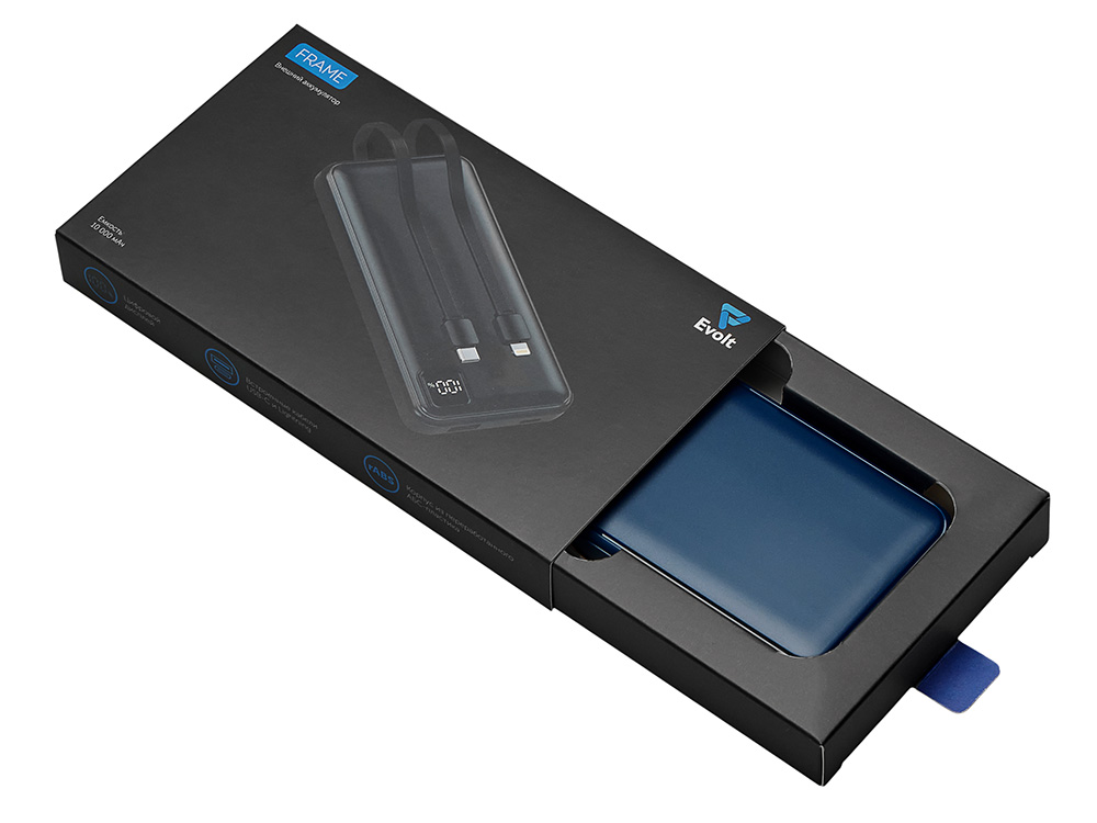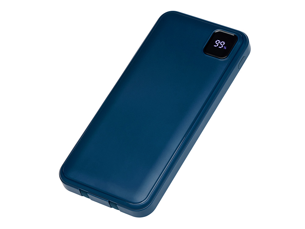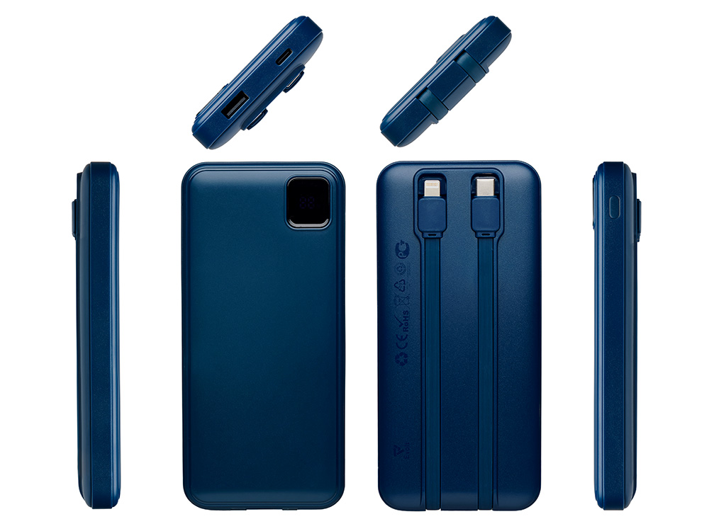 Удобный внешний аккумулятор с встроенными кабелями USB-C и Lightning — ваш надежный партнер в путешествиях, на встречах и в повседневных задачах. Цифровой дисплей в реальном времени показывает точный остаток заряда, а компактные габариты делают его таким же удобным, как смартфон. Прочный корпус из переработанного АБС-пластика и емкость 10000 мАч обеспечивают долгую работу даже при интенсивном использовании. Идеальный выбор для тех, кто ценит комфорт и функциональность в одном устройстве. Продуманная упаковка: для открытия просто потяните за язычок, и появится гаджет с нанесением. - Встроенные кабели USB-C и Lightning — больше не нужно искать провода - Цифровой дисплей с точным отображением заряда - Удобная зона под нанесение логотипа - Компактный размер, сопоставимый с телефоном — легко помещается в карман, сумку или портфель. - Упаковка с удобным и быстрым открытием