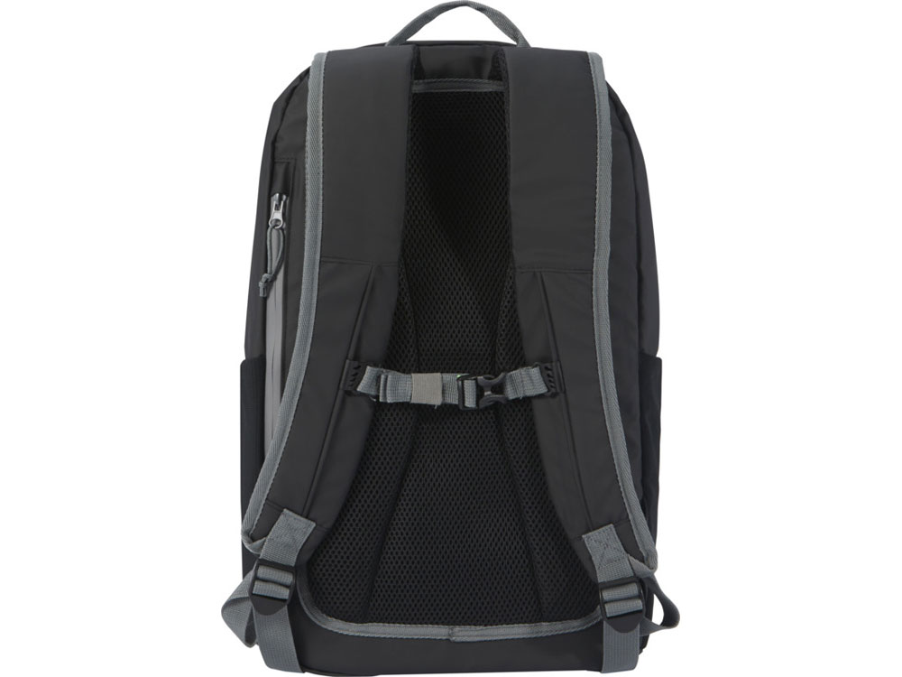 Водонепроницаемый рюкзак для ноутбука, изготовленный из переработанных материалов, сертифицированных согласно стандарту GRS, включая застежки-молнии. Имеет отделение с подкладкой, в которое помещается ноутбук с диагональю 15 дюймов, боковое отверстие для быстрого доступа, несколько сетчатых карманов, передний карман на молнии, а также светоотражающую окантовку для видимости. Формованная мягкая спинка и регулируемый нагрудный ремень обеспечивают комфорт даже тогда, когда рюкзак полностью загружен. Из переработанных материалов, сертифицированных по стандарту GRS, изготовлены основная ткань, подкладка, лямки и застежки-молнии. Емкость: 21 литр. Не содержит ПВХ.