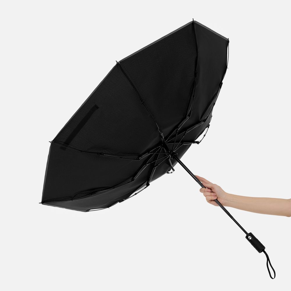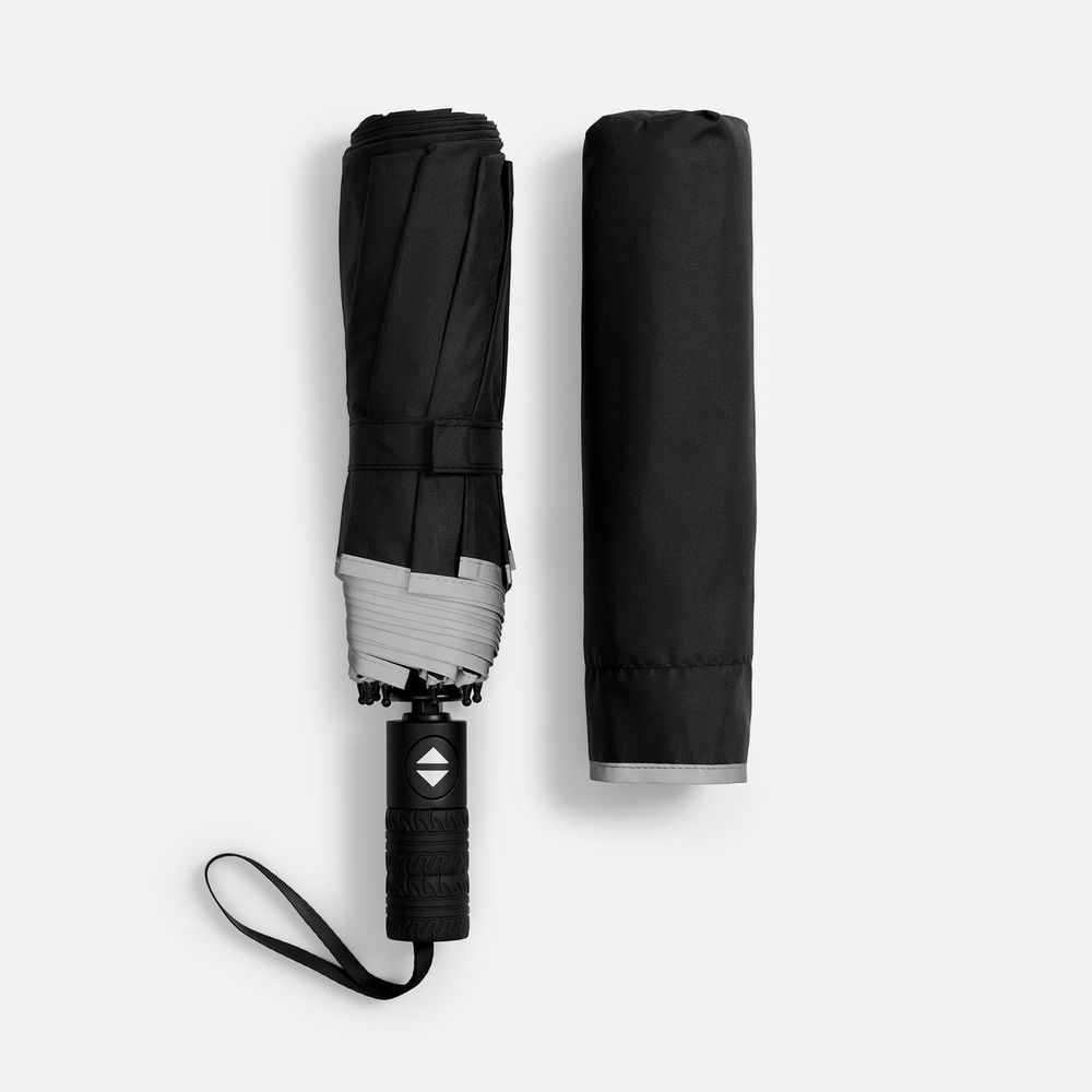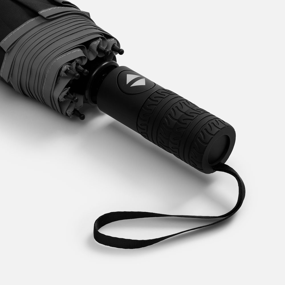 Стильный прочный зонт Tyre не боится ржавчины и нагрузок благодаря каркасу из стекловолокна. Светоотражающий кант делает этот зонт незаменимым спутником в темное время суток, а тактильный рисунок протектора шины на ручке превращает его в продуманный подарок для автолюбителей и партнеров автомобильной сферы.